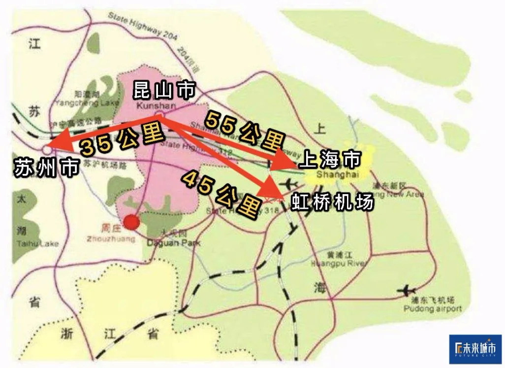 昆山虽小,却介于两大城市上海、苏州之间,距虹桥国际机场 45 公里 , 距上海港货运码60公里 , 京沪铁路和沪宁高速公路穿越而过。产业上,昆山发展工业所缺的资金、技术、设备等因素恰恰是上海的优势,而昆山在劳动力、土地资源、农副产品等方面的优势刚好能补上海的不足,上海的溢出效应顺理成章地流向仅55公里外的昆山。