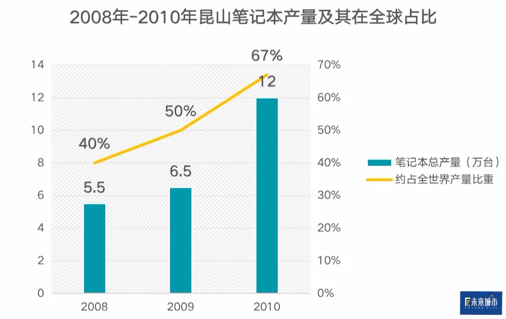 十年突围斩棘,到2010年,昆山出产的笔记本电脑达到峰值的1.2亿台,占全球总产量的三分之二。坊间笑谈,如果昆山IT企业感冒,全球IT市场都要打喷嚏。