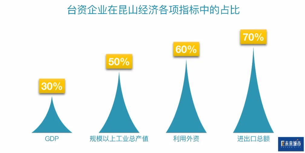 目前,台资企业贡献了昆山全市地区生产总值的30%,规模以上工业总产值的50%,利用外资的60%,进出口总额的70%。截至2020年7月底,昆山累计批准台资项目5299个,其中增资项目2490个,投资总额637.83亿美元,注册资本326.83亿美元。25家台资企业上市挂牌,居大陆县级市首位,占江苏全省总数的一半以上。