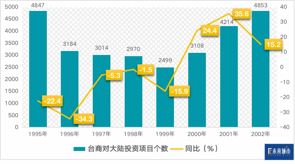 外经贸部台港澳司的数据表明,2001年是自1995年以来台商投资大陆增幅最大的一年,共批准台资项目4214个,同比增长35.6%;实际使用台资金额29.8亿美元,同比增长29.8%。