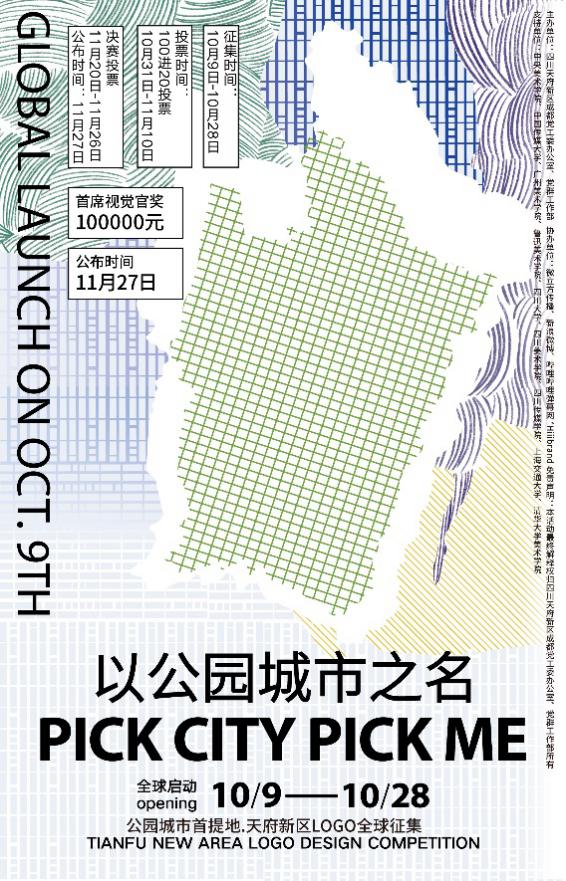 本次“公园城市首提地·天府新区LOGO全球征集大赛由四川天府新区成都党工委管委会主办,中央美术学院、中国传媒大学、广州美术学院、鲁迅美术学院、四川大学、四川美术学院、四川传媒学院、上海交通大学、清华大学美术学院等单位支持,微立方传播、新浪微博、哔哩哔哩弹幕网、Hiiibrand等单位协办。大赛征集时间为10月9日-10月28日,通过投票和决赛角逐,将于11月27日公布最终获奖名单。