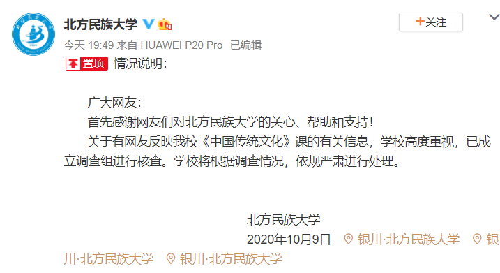 近日,有网友爆料,北方民族大学一堂《中国传统文化》课中,老师连续3节课讨论“女德”,并在PPT中多次提及“妇行”、“男尊女卑”、“夫妇有别”等内容,引发网友热议。10月9日,北方民族大学官方微博发布情况说明称,学校高度重视,已成立调查组进行核查。学校将根据调查情况,依规严肃进行处理。
