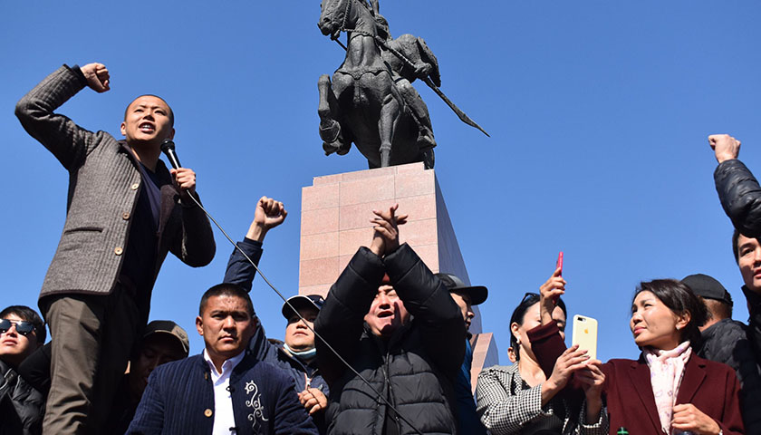 因对本月4日议会选举初步结果不满,吉尔吉斯斯坦多个落选政党5日在比什凯克市中心的阿拉套广场组织示威集会,要求取消选举结果,以及总统热恩别科夫下台。
