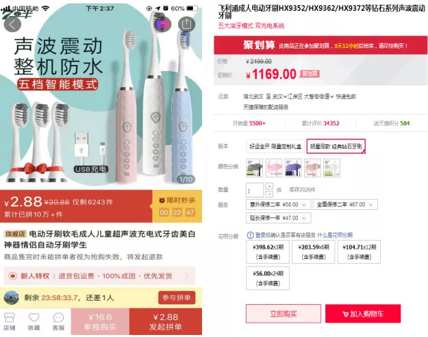 青眼注意到,拼多多上一款品牌名为“7点半”的电动牙刷售价仅为2.88元且还包邮,累计销量已过10万件,其宣称该牙刷“声波震动、整机防水、五档智能模式”,成人和儿童都可以用;而在天猫上,一款飞利浦的电动牙刷售价是1169元,同样是声波震动,两者价格相差406倍,该产品月销显示为5500+。