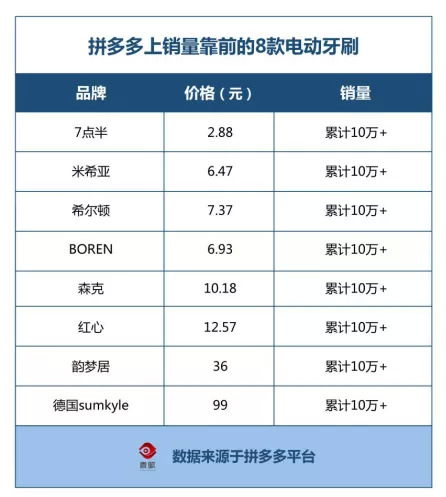 事实上,拼多多上销量惊人的低价电动牙刷十分常见。根据青眼的不完全统计,拼多多平台排名靠前的8款电动牙刷中,有6款产品价格低于13元,其中低于10元的电动牙刷占比50%。且这8款产品销量都在10万以上,其中价格最高的一款售价也仅为99元。