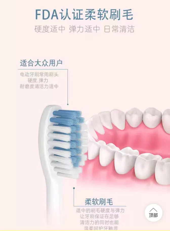 然后在刷头的选择上,1169元的飞利浦电动牙刷宣传自己采用的是全球知名的杜邦刷毛;而2块8的电动牙刷则以FDA(美国食品药品监督管理局)来背书,宣传自己是FDA认证过的刷毛。