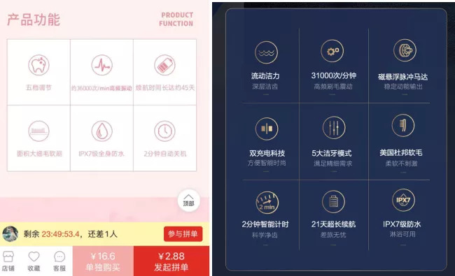 2.88元的电动牙刷功能宣称(截自拼多多);1169元的电动牙刷功能宣称(截自天猫)