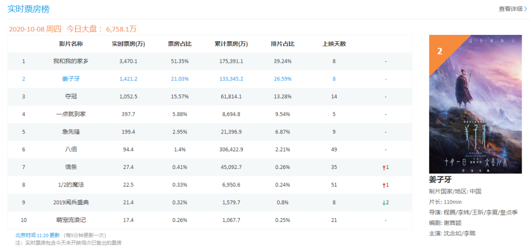 《姜子牙》也同样有一个好的上线时间点,受疫情影响,院线断档了好几个月,十一黄金周是电影消费需求报复性反弹的窗口期,观众普遍对走进影院看一部好片抱有极大的热情。