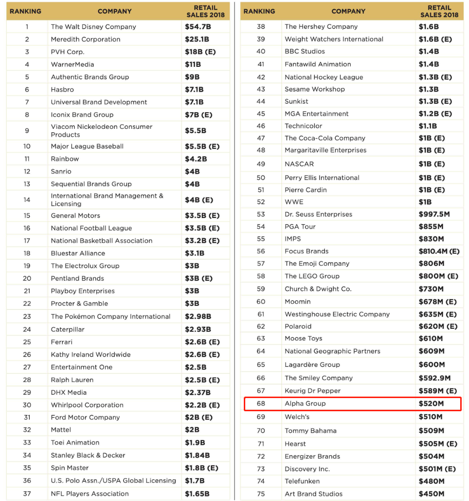 奥飞娱乐在喜羊羊、超级飞侠等IP基础上,发展玩具、婴童业务、影视业务。连续两年跻身授权业全球百强。由《全球授权》杂志发布的全球150强授权商排行榜上,奥飞娱乐2018年位列第81名,2019年上升13名位列68名。授权渗透了消费品、服装服饰、家居用品、图书出版、网络游戏、餐饮娱乐、亲子旅游等。