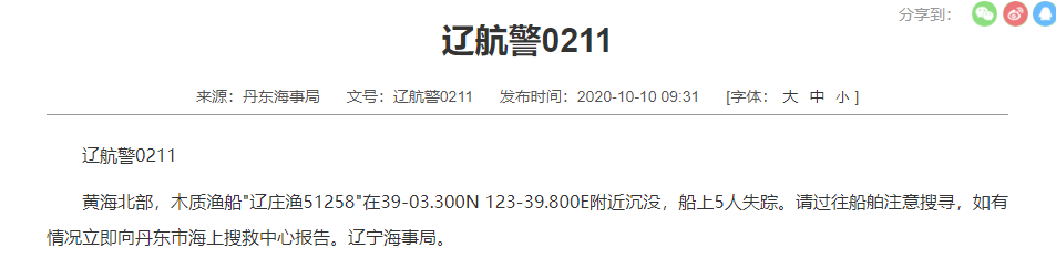 海事局网站10月10日消息,丹东海事局通报,黄海北部,木质渔船“辽庄渔51258”在39-03.300N 123-39.800E附近沉没,船上5人失踪。请过往船舶注意搜寻,如有情况立即向丹东市海上搜救中心报告。