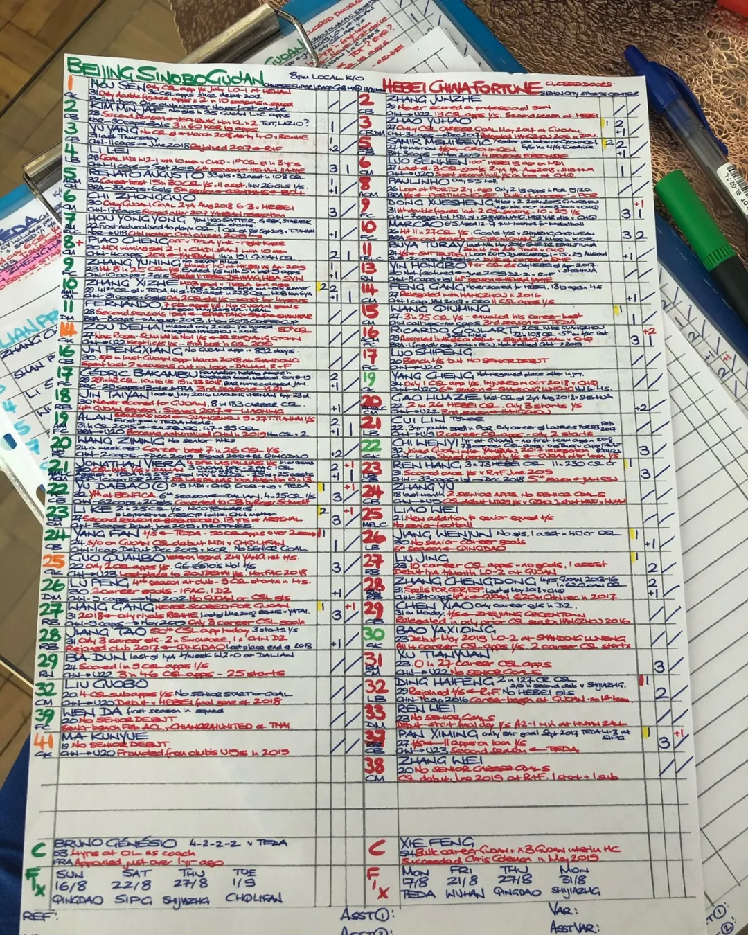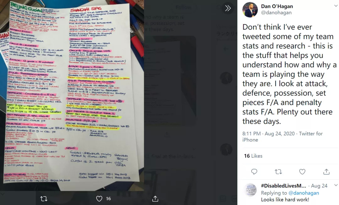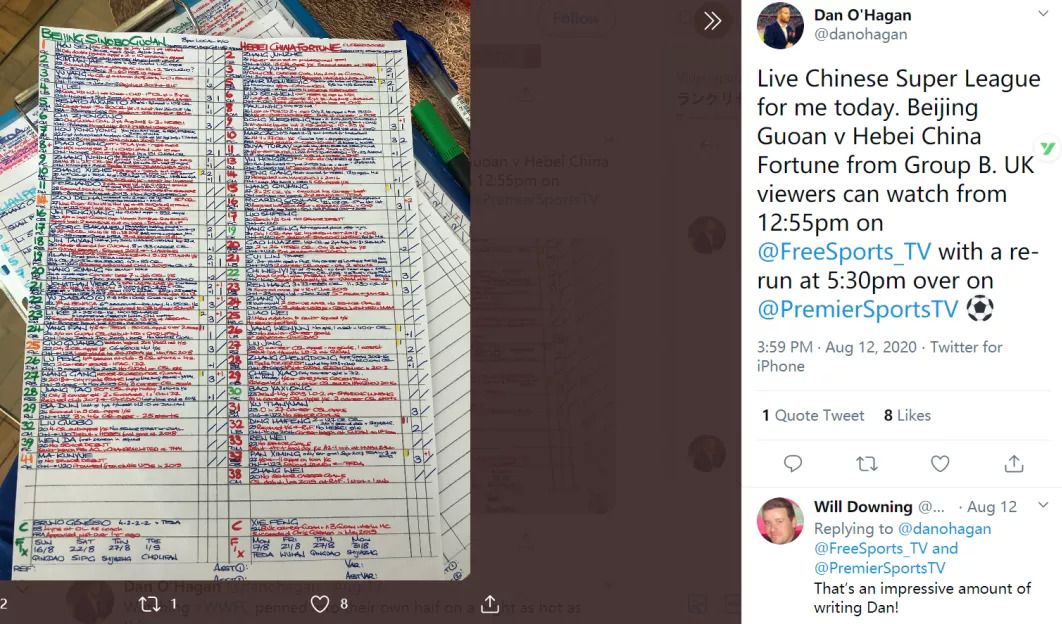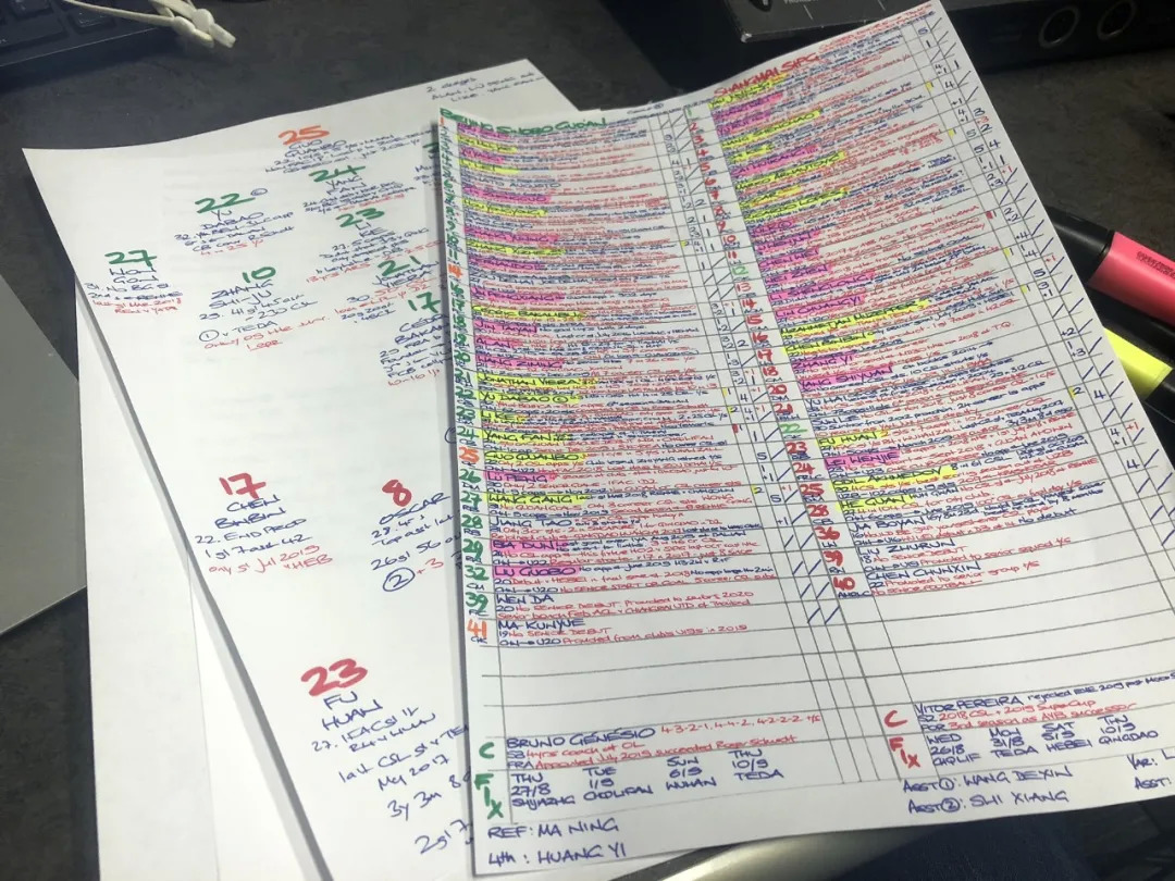 是的,你没有看错,图片里这两张密密麻麻的资料,就是英国职业解说员丹-奥哈根,在解说8月22日北京中赫国安vs上海上港赛前,所做的解说「功课」。