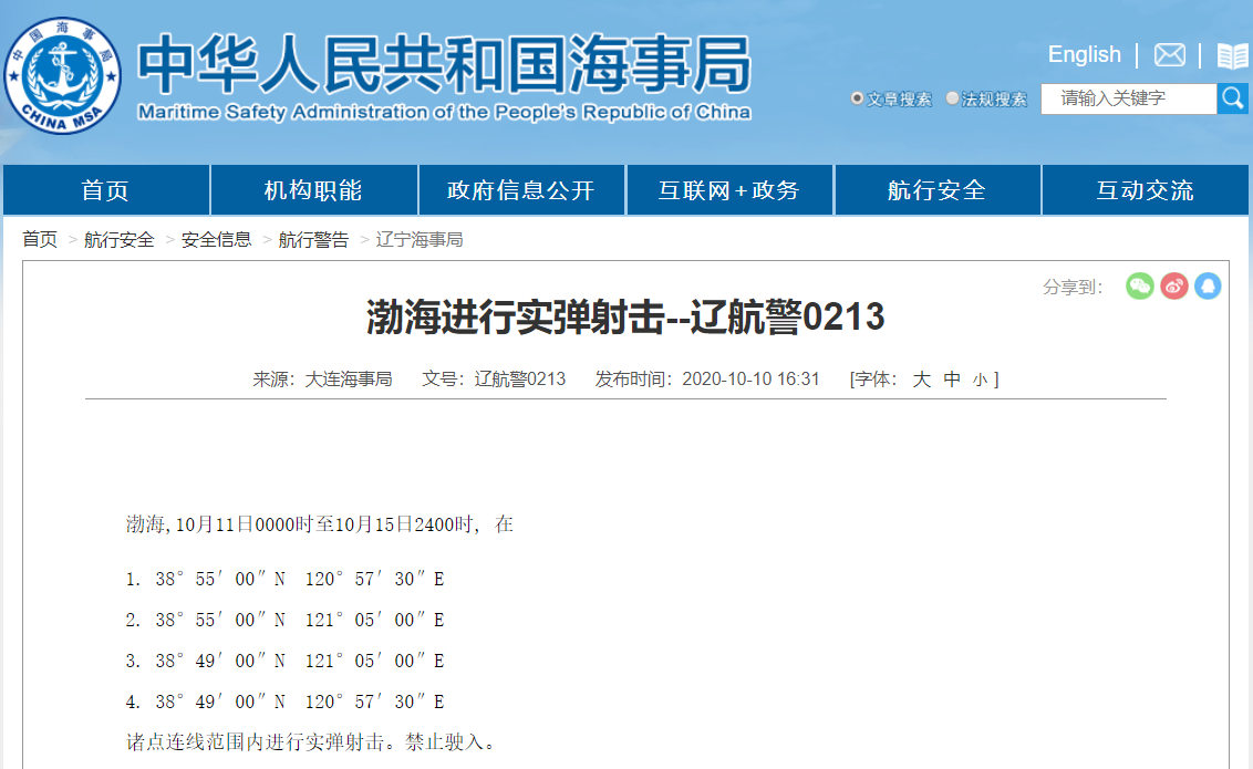 大连海事局发布航行警告:渤海,10月11日0000时至10月15日2400时, 在