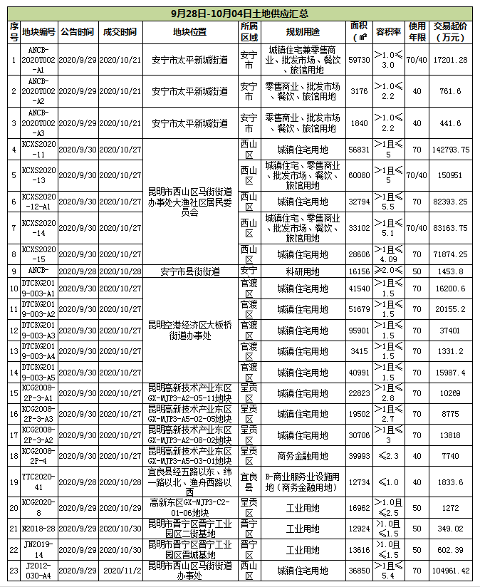 土地方面,包含晋宁区在内,上周本地共有5宗土地成功交易,总成交面积约241亩,成交金额约4.6亿元;土地供应方面,包含安宁市、晋宁区及宜良县在内,上周本地共供应了23宗土地,总面积约1098亩,交易起价约79亿元。