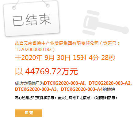 这其中,4宗位于昆明空港经济区大板桥街道办事处面积约226亩的居住、商服及混合用地,最终被云南省滇中产业发展集团有限责任公司以4.5亿元底价斩获,成交楼面价约664~1200元/㎡。