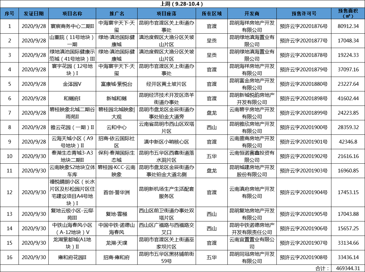 上周获证的14个项目分别位于官渡、西山、五华、盘龙、呈贡5个区。其中,官渡区有6个项目拿到7张预售证,以约27.6万方的新增预售面积,占上周总新增预售面积的59%。
