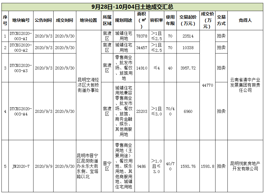 5宗位于昆明空港经济区大板桥街道办事处面积约350亩的居住用地,交易起价约9.1亿元,起始楼面价约2600元/㎡。