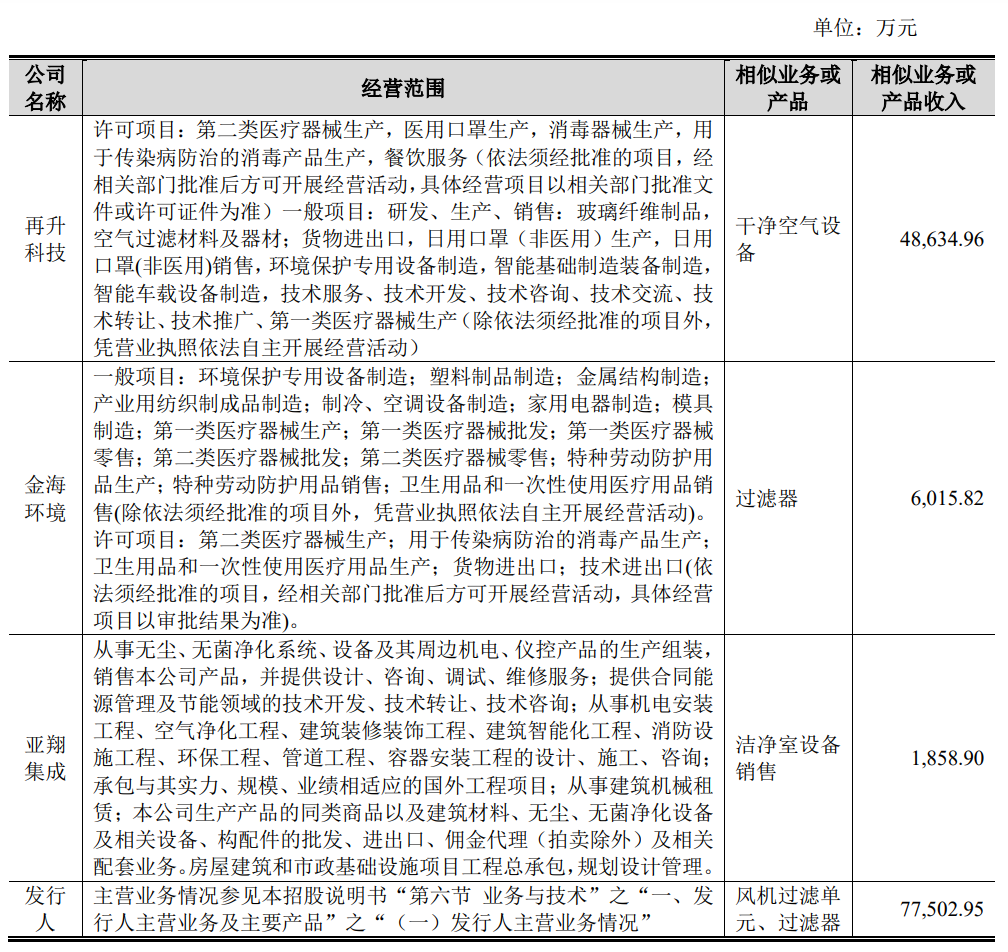 美埃科技称,公司的竞争对手中,再升科技(603601.SH)、金海环境(603311.SH)和亚翔集成(603929.SH)为A股上市公司,从事与美埃科技相似或相关的业务。不过2019年再升科技的相关业务收入4.86亿元,金海环境和亚翔集成的相关收入还未破亿,相比之下,美埃科技7.75亿元的收入傲视A股同行。