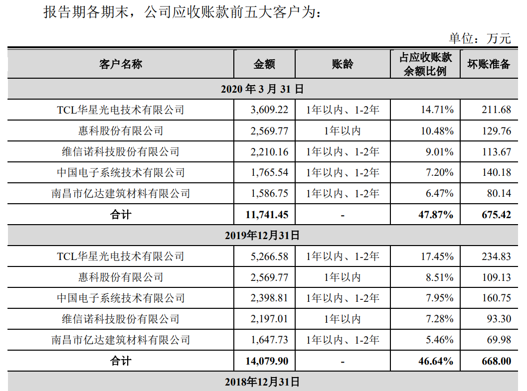应收账款客户名单中,2019年和2020年一季度里,TCL华星光电技术有限公司均居首,涉及金额分别为5266.58万元和3609.22万元,能占到应收账款余额比例分别为17.45%和14.71%。其次要数惠科股份有限公司、维信诺科技股份有限公司、中国电子系统技术有限公司等公司为多,公司应收账款前五客户的合计比例逼近五成。