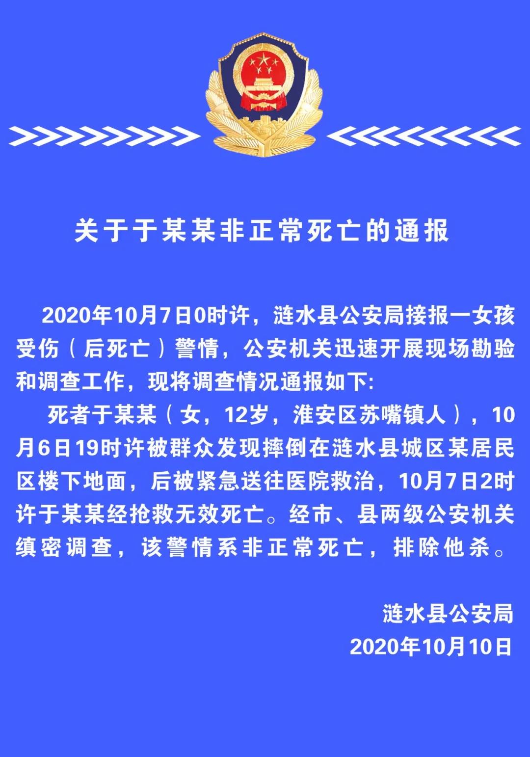 死者于某某(女,12岁,淮安区苏嘴镇人),10月6日19时许被群众发现摔倒在涟水县城区某居民区楼下地面,后被紧急送往医院救治,10月7日2时许于某某经抢救无效死亡。经市、县两级公安机关缜密调查,该警情系非正常死亡,排除他杀。
