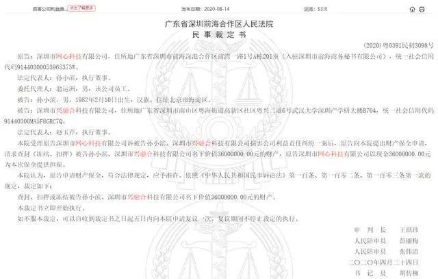 另外,今年8月前海合作区人民法院公开的一审判决书显示,兴融合法定代表人孙小滨和公司被网心起诉损害公司利益,最终孙小滨和兴融合名下价值3600万元的资产被依法查封、扣押或冻结。