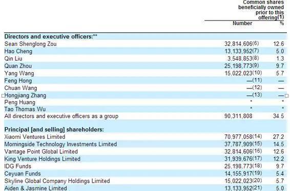 与此同时,邹胜龙和程浩两位创始人的股权合计也降至17.6%,此前在E轮融资中注入巨资的小米集团则跃升为第一大股东,持股27.2%。此外,雷军金山系的持股比例也达12.2%。