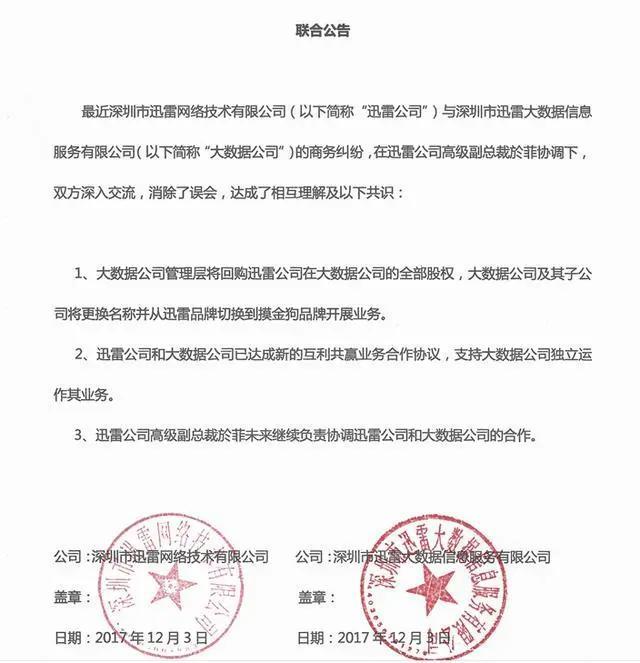最后,双方一致决定由大数据公司回购迅雷在自身的所有股权,并从迅雷品牌转至摸金狗品牌继续开展业务。