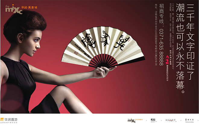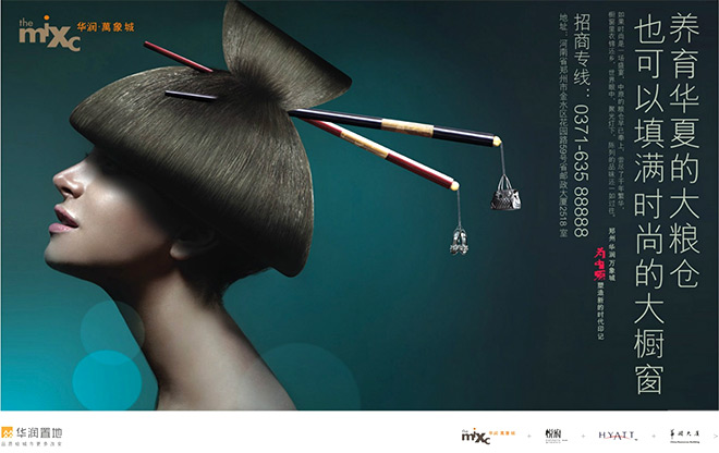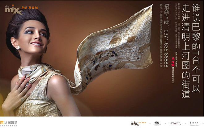 简单评述:将大宋朝最繁华的历史和现代摩登女郎的丝巾结合,将中原的农业文明通过新潮的发型演绎出来….这则广告告诉我们:时尚是对文化的继承和传承。作品将中原古代文化与现代时尚做到了完美结合,在引发受众对中原古代商业文明(张择端《清明上河图》则是最具代表性的体现)记忆的同时,激发消费者对华润•万象城的期待。
