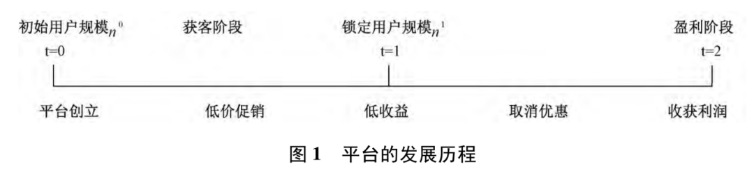 t=0到t=1时期是获客阶段,t=0时刻开始,平台可以选择通过补贴,低价等手段扩大用户规模。等到这个时期结束t=1,平台锁定的用户规模,t=1到t=2时期是盈利阶段。