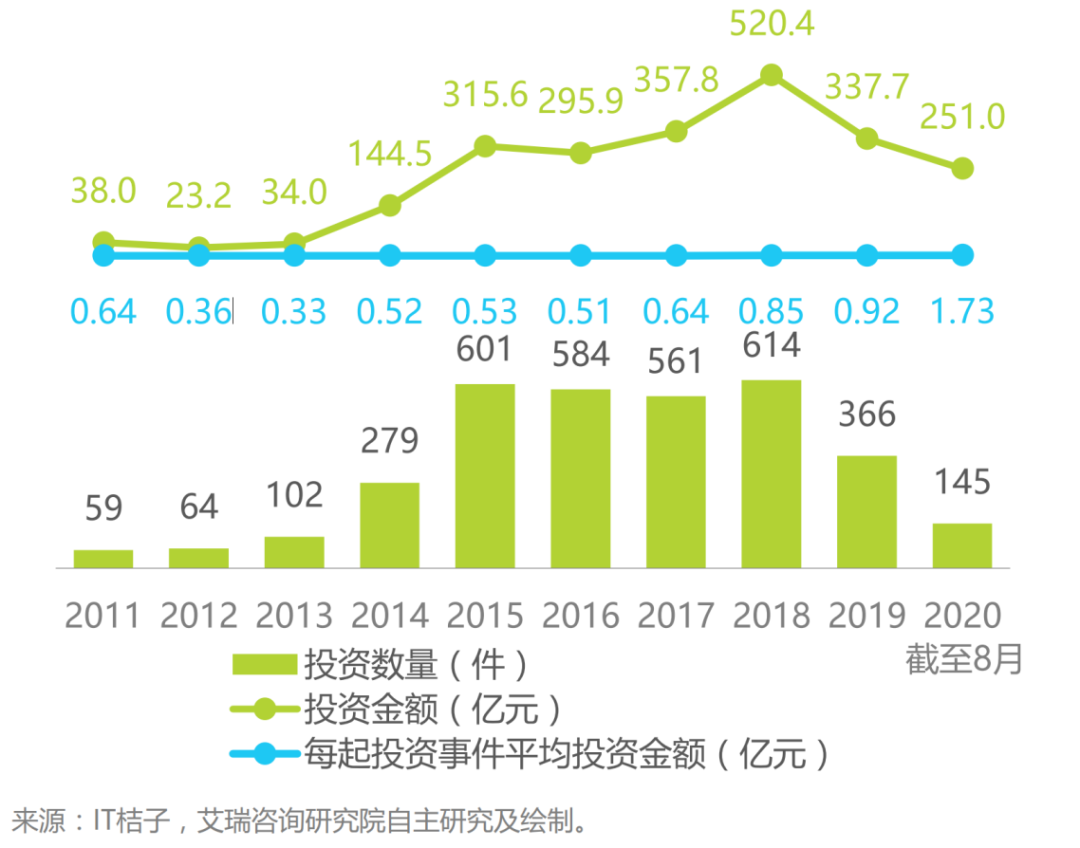2011-2020年中国教育行业企业所获投资数量及金额情况,来源:艾瑞咨询