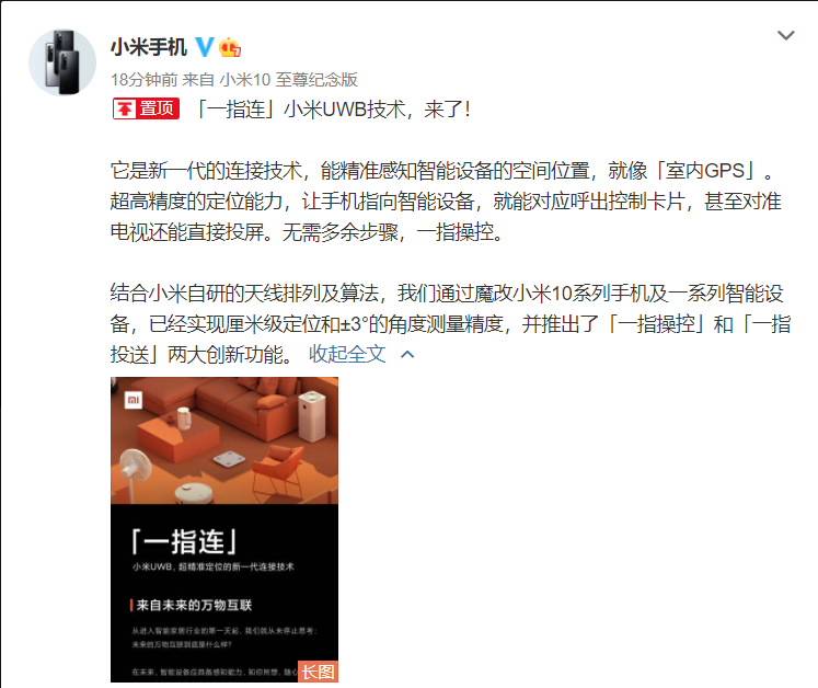 10月12日,小米宣布发布UWB技术,可以让支持小米UWB技术的手机实现对智能设备的厘米级定位,指向任意智能设备都可直接控制,角度测量精度可达±3°,如同高精版“室内GPS”。