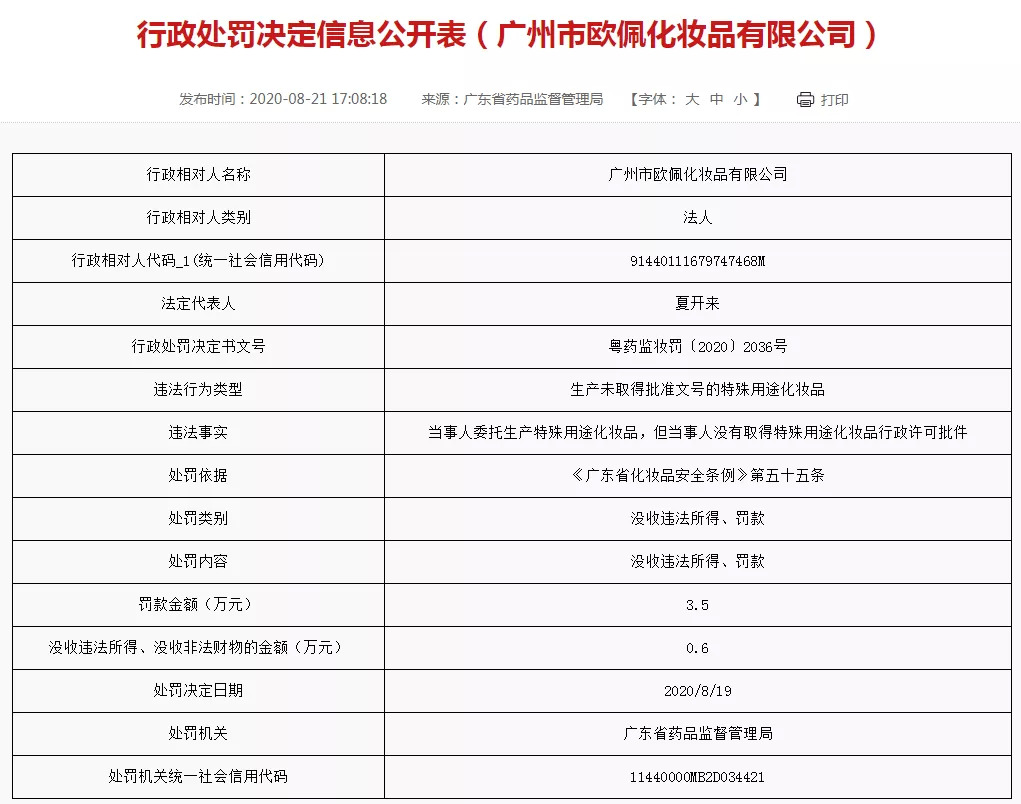 而“碧素堂护手霜”的生产企业广州市欧佩化妆品有限公司在今年8月,因生产未取得批准文号的特殊用途化妆品而被广东药监局罚款3.5万元。近年,该公司还因仿冒一叶子面膜包装、侵犯明星陈乔恩的肖像权等一系列问题,身陷多起纠纷案。