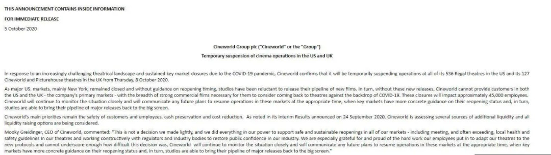 公司声明指出,“Cineworld将继续密切关注形势,并将在适当的时候就在两大市场恢复运营的任何计划进行沟通,届时将对这些市场重新开业情况给出更具体的指导。”