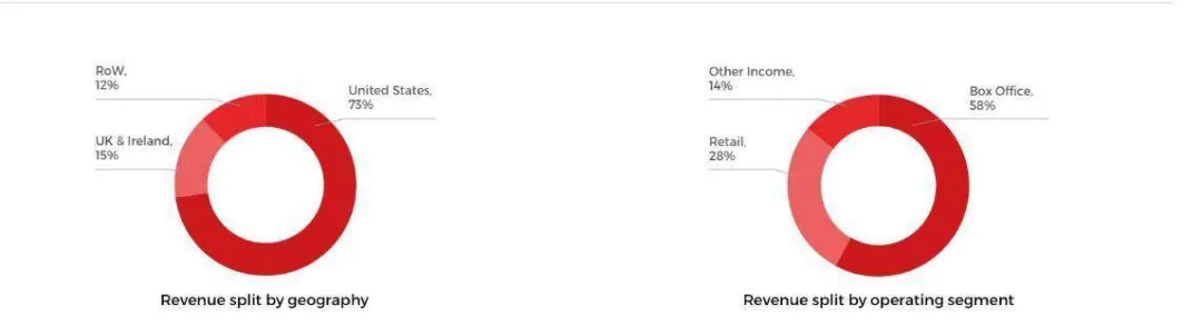 Cineworld去年营收达43.7亿美元,美国和英国是Cineworld最大的两个市场,给公司贡献了88%的营收。而在公司业务架构中,电影票房收入占近六成。