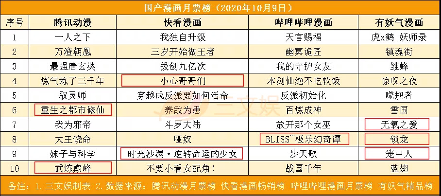 腾讯动漫方面,《一人之下》由上周的榜单第七名登顶榜首,本周收获月票数2.59万张。另外,本周有2部新晋榜单作品,分别是《重生之都市修仙》、《武炼巅峰》。