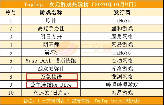 TapTap二次元游戏热玩榜方面,米哈游的新游戏《原神》蝉联榜首,截至10月9日,在TapTap上有389万人安装,522万人关注。