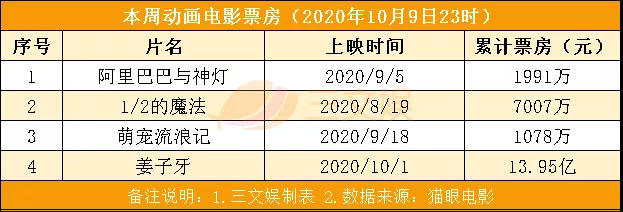 动画电影方面,本周在映动画电影中,《姜子牙》票房排名依旧第一。