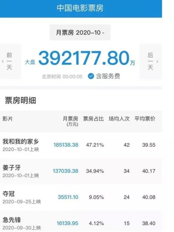 2020年国庆档(10月1日-10月8日)落下帷幕,根据国家电影专项资金办公室"中国电影票房APP"数据显示,截至10月8日24时,2020年国庆档票房约为39.2亿元,取得中国影史国庆档票房第二的成绩。