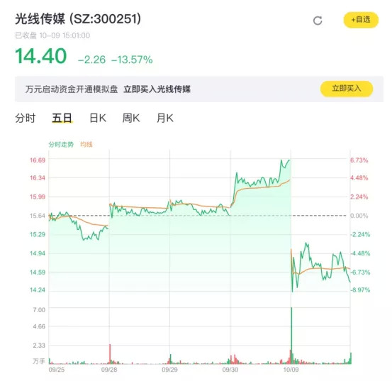 资本市场在国庆档后的首个交易日也体现出了“失望”, 10月9日,光线传媒盘中一度大跌17.17%至13.8元,创2015年上市以来最大跌幅。当日收盘跌13.57%,是当日跌幅最大的影视股之一,较节前最后一个交易日收盘市值缩水近66亿元。
