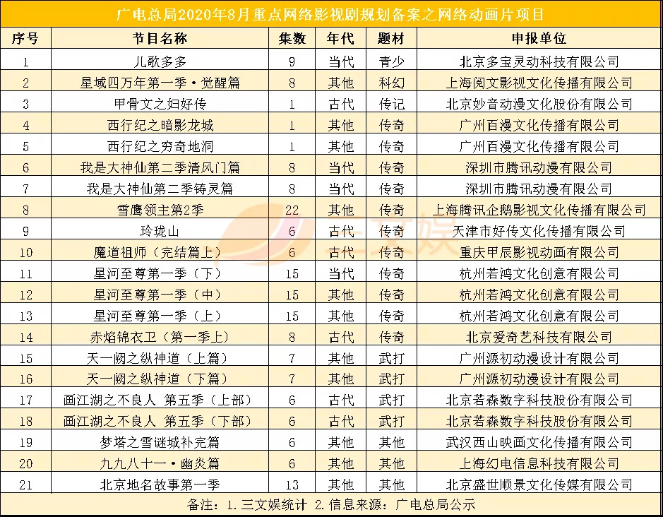 3. 8月有21部动画片备案,包括《魔道祖师完结篇》等