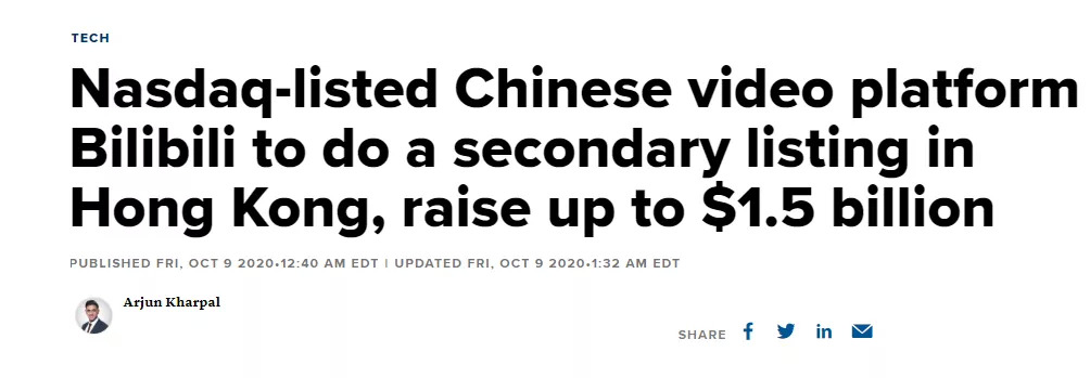 10月10日,据CNBC报道,B站正在加紧准备在香港二次上市。此次回港二次上市的募资金额可能达到15亿美元。