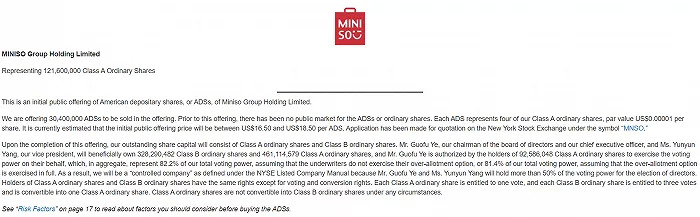 10月8日,名创优品更新招股书显示,计划在美国的IPO发行3040万美国存托股份(ADS),每股发行的价格区间为16.50美元至18.50美元,拟融资额度为(包含超额配售权)5.76亿美元~6.47亿美元。