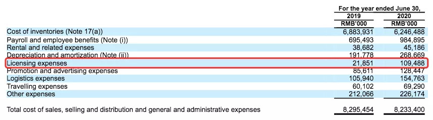 在2019财年(2018年7月1日到2019年6月30日),名创优品的授权成本是2190万元;到了2020财年,这一数字猛增到1.095亿。