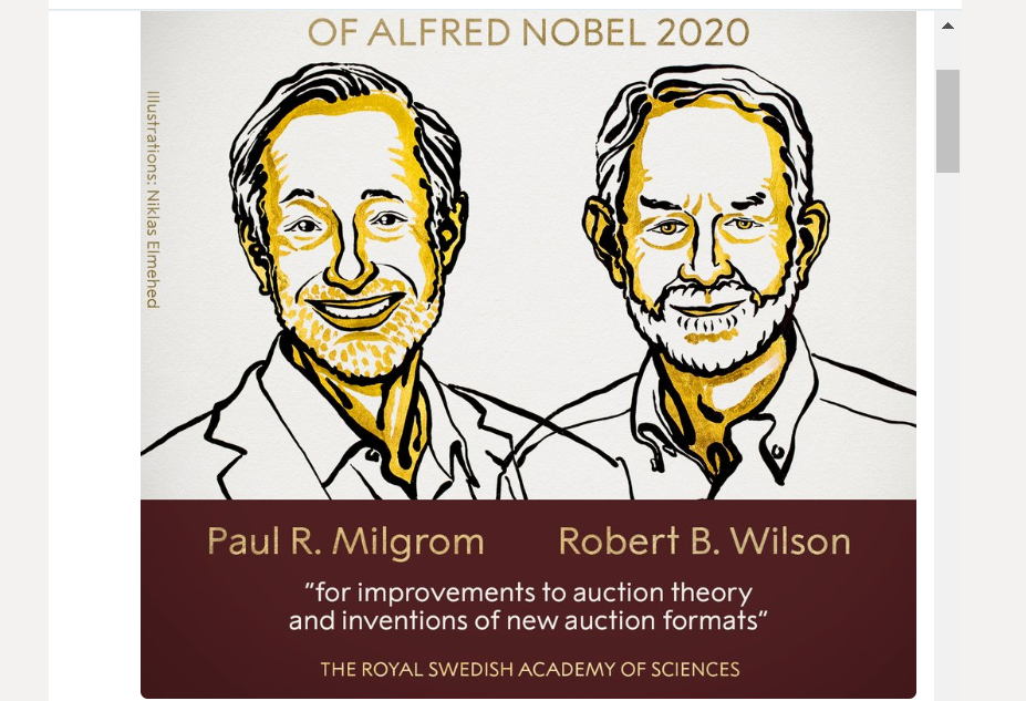 诺贝尔奖官网北京时间10月12日下午宣布,来自美国斯坦福大学的两位教授保罗·米尔格罗姆(Paul Milgrom)和罗伯特·威尔逊(Robert Wilson)获得2020年度诺贝尔经济学奖,以表彰他们在改进拍卖行为方面的贡献。