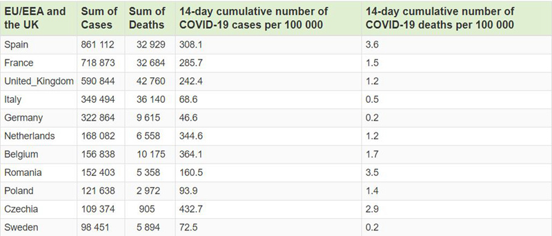根据欧洲疾控中心的统计,截至11日,欧洲累计确诊最多的国家分别为西班牙、法国、英国、意大利和德国。