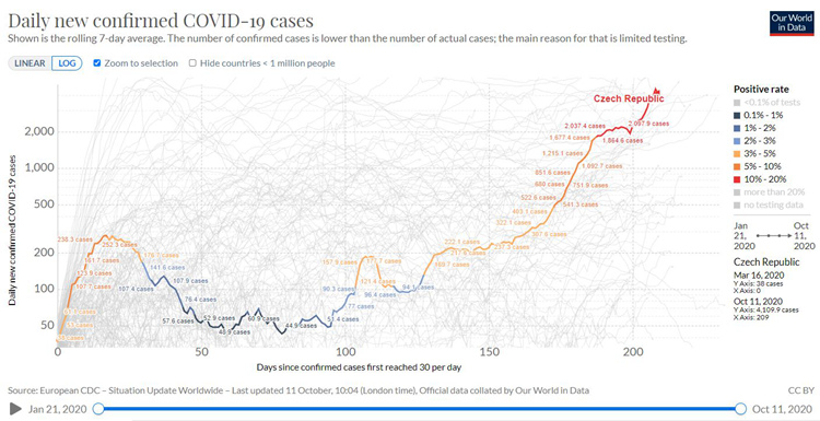 普里米拉在就职时警告,如果捷克的单日新增病例涨至6000到8000例,将超过卫生医疗系统的承受范围。10月9日,捷克新增确诊8618例,创下疫情以来最高。