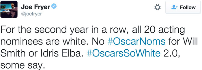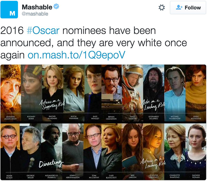 “连续两年,全部20位演员提名均为白人,而今年有着出色表现的黑人演员威尔·史密斯和伊德里斯·艾尔巴都没被提名,全白奥斯卡您真是好样的。”