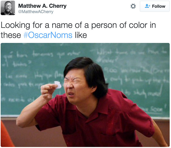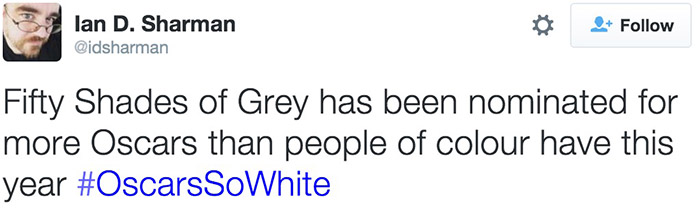 “连《五十度灰》这种大烂片都比有色人种获得的提名多,奥斯卡真白。”