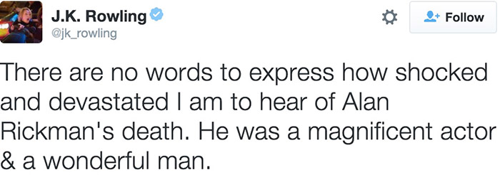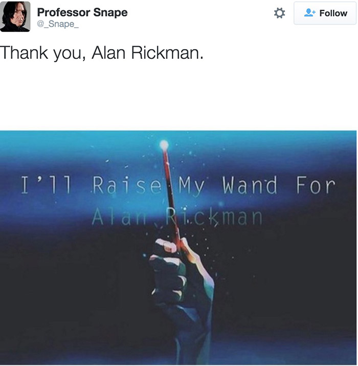 著名Twitter账号“斯内普教授”表示:“谢谢你,艾伦。”