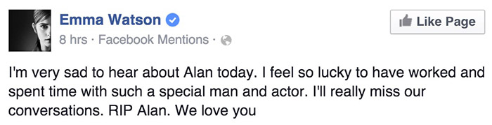 赫敏的扮演者艾玛沃特森在Facebook上表示:“能与艾伦一起工作是我的幸运,永远爱你。”