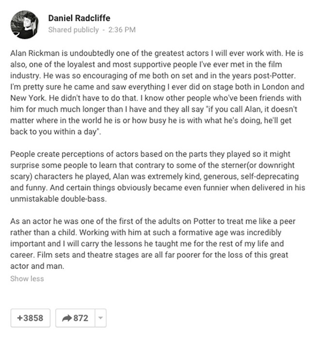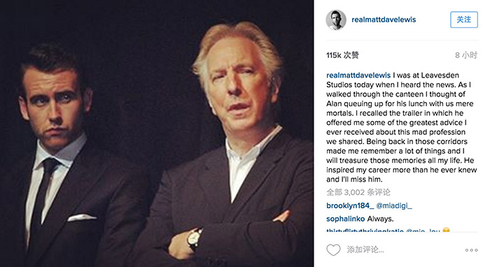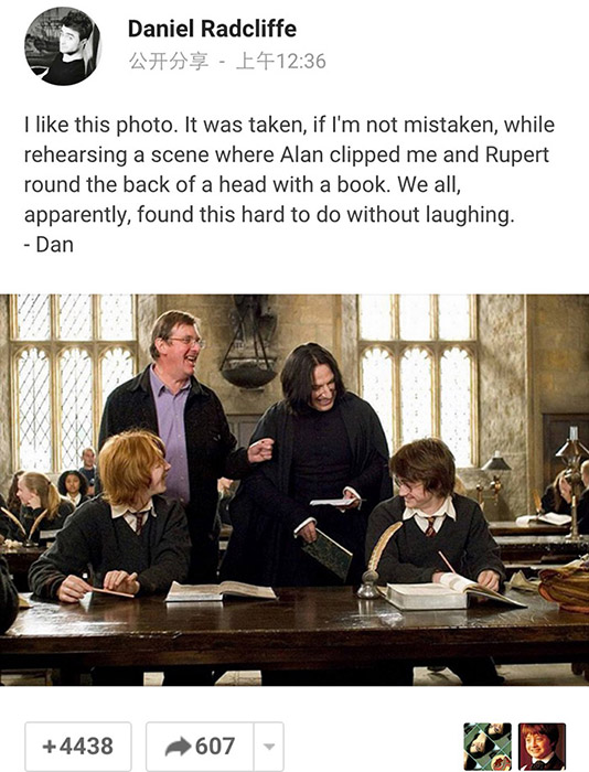 哈利波特的扮演者丹尼尔·德雷克里夫在Google+上撰写长文,并发布了一张剧照,表达对艾伦·里克曼的哀思。
